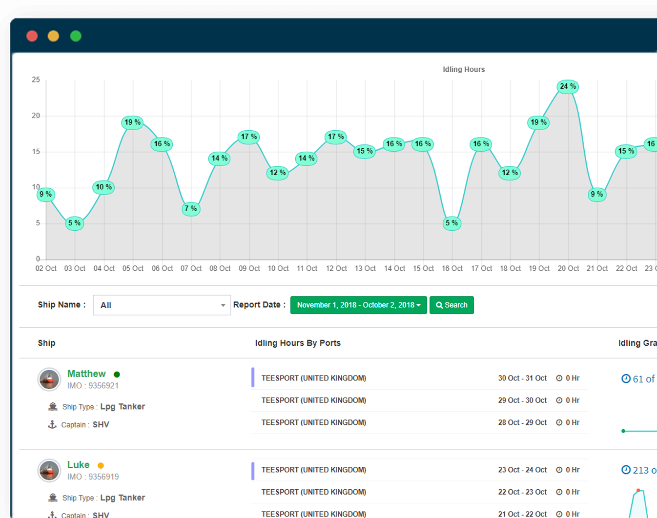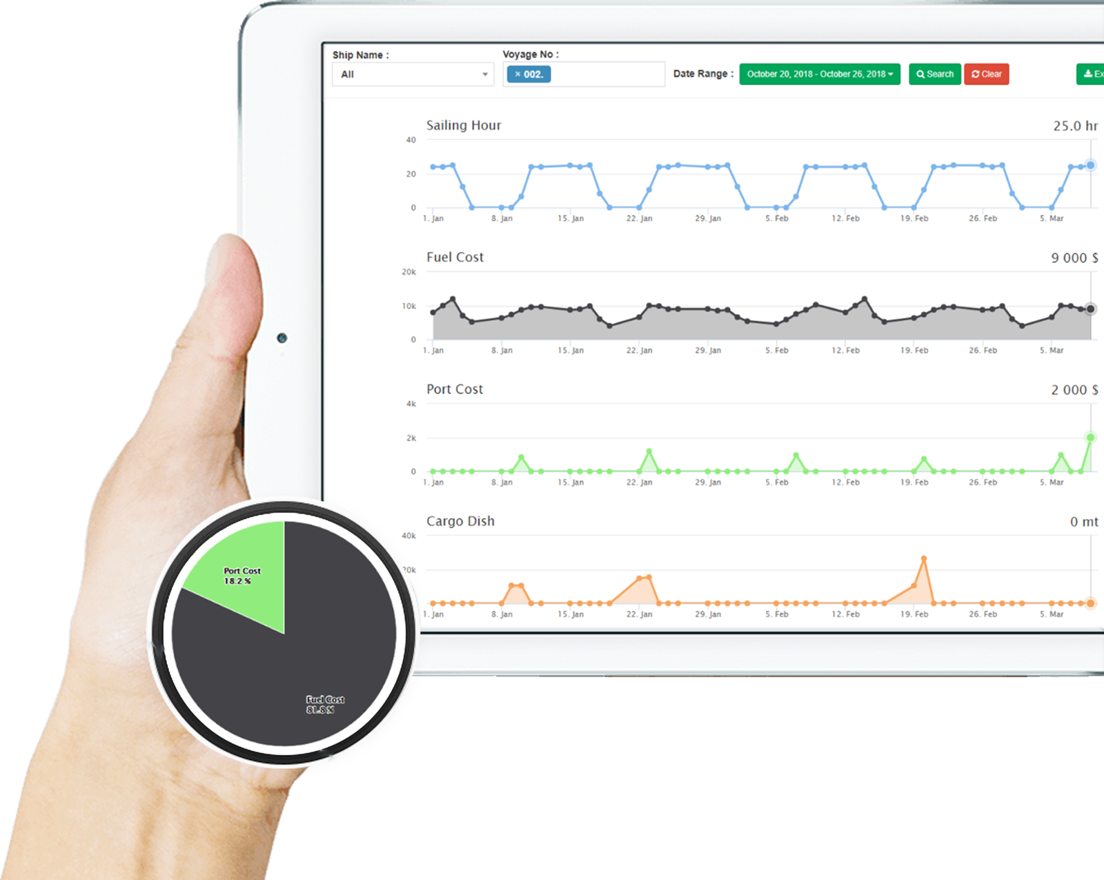 Based on the LC Voyager fuel and energy performance management. It offers a valuable dashboard to ship charters, allowing them to monitor and compare their vessel's or fleet's performance fuel performance in real-time and/or based on daily reports